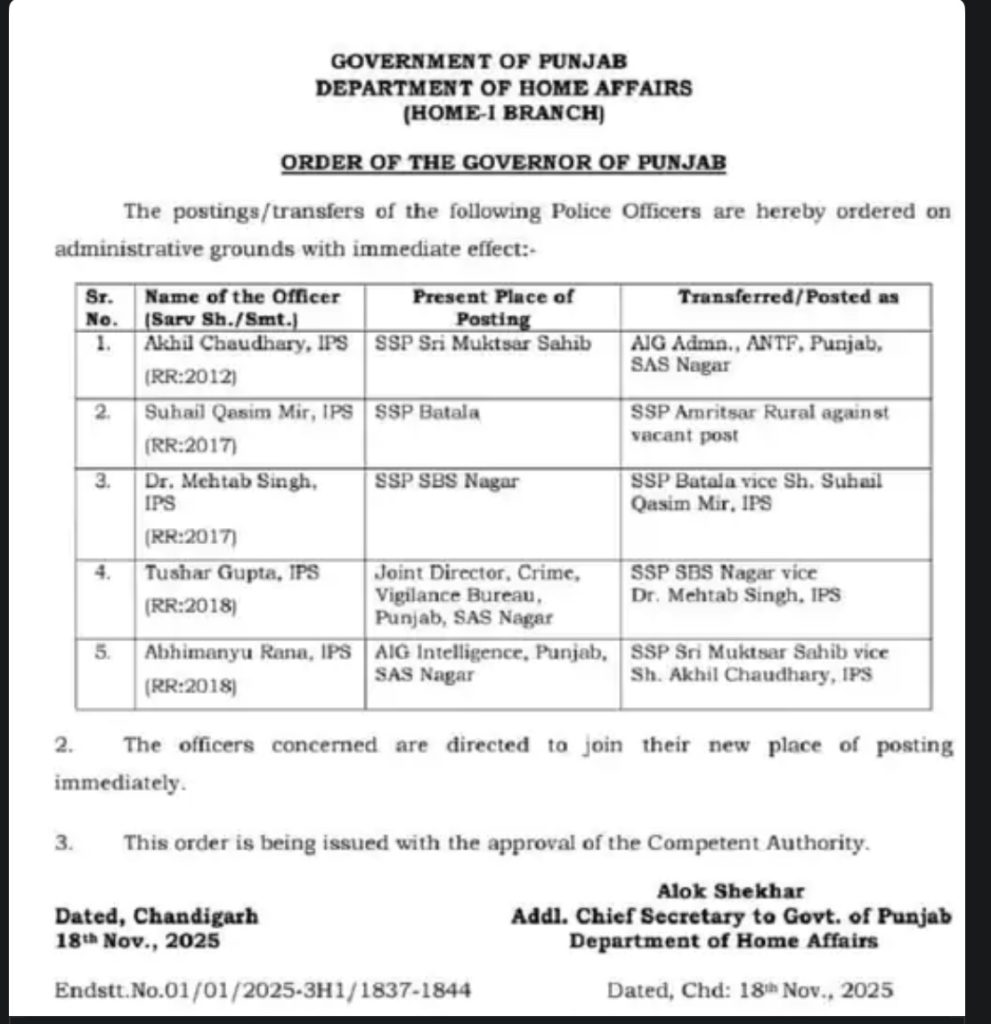 ਸਰਕਾਰ ਵੱਲੋਂ ਜਾਰੀ ਹੁਕਮਾਂ ਅਨੁਸਾਰ, ਬਟਾਲਾ ਦੇ ਐਸਐਸਪੀ ਸੋਹੇਲ ਕਾਸਿਮ ਮੀਰ ਹੁਣ ਅੰਮ੍ਰਿਤਸਰ ਦਿਹਾਤੀ ਦੇ ਐਸਐਸਪੀ ਹੋਣਗੇ। ਬਟਾਲਾ ਵਿੱਚ ਉਨ੍ਹਾਂ ਦੀ ਥਾਂ ਐਸਬੀਐਸ ਨਗਰ ਦੇ ਐਸਐਸਪੀ ਮਹਿਤਾਬ ਸਿੰਘ ਨੂੰ ਨਿਯੁਕਤ ਕੀਤਾ ਗਿਆ ਹੈ।