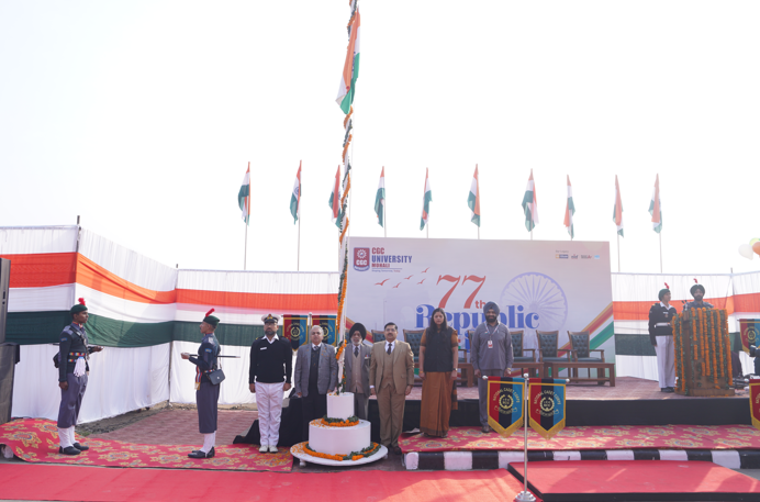 ਸੀਜੀਸੀ ਯੂਨੀਵਰਸਿਟੀ, ਮੋਹਾਲੀ ਵਿੱਚ ਭਾਰਤ ਦਾ 77ਵਾਂ ਗਣਤੰਤਰ ਦਿਵਸ ਸੰਸਥਾਗਤ ਅਤੇ ਗੰਭੀਰ ਮਾਹੌਲ ਵਿੱਚ ਮਨਾਇਆ ਗਿਆ। ਸਮਾਗਮ ਵਿੱਚ ਸਾਬਕਾ ਕਰਨਲ ਦਲਜੀਤ ਸਿੰਘ ਚੀਮਾ (ਰਿਟਾਇਰਡ) ਨੇ ਮੁੱਖ ਮਹਿਮਾਨ ਵਜੋਂ ਸ਼ਿਰਕਤ ਕੀਤੀ। ਉਨ੍ਹਾਂ ਦੀ ਮੌਜੂਦਗੀ ਨਾਲ ਸਮਾਰੋਹ ਨੂੰ ਵਿਸ਼ੇਸ਼ ਮਹੱਤਤਾ ਮਿਲੀ। ਆਪਣੇ ਲੰਮੇ ਫੌਜੀ ਅਨੁਭਵ ਅਤੇ ਸੇਵਾ ਭਾਵਨਾ ਲਈ ਜਾਣੇ ਜਾਂਦੇ ਕਰਨਲ ਚੀਮਾ ਦੀ ਹਾਜ਼ਰੀ ਨੇ ਅਨੁਸ਼ਾਸਨ, ਨੇਤ੍ਰਿਤਵ ਅਤੇ ਦੇਸ਼ ਪ੍ਰਤੀ ਸੇਵਾ ਦੇ ਆਦਰਸ਼ਾਂ ਨੂੰ ਉਭਾਰਿਆ।
