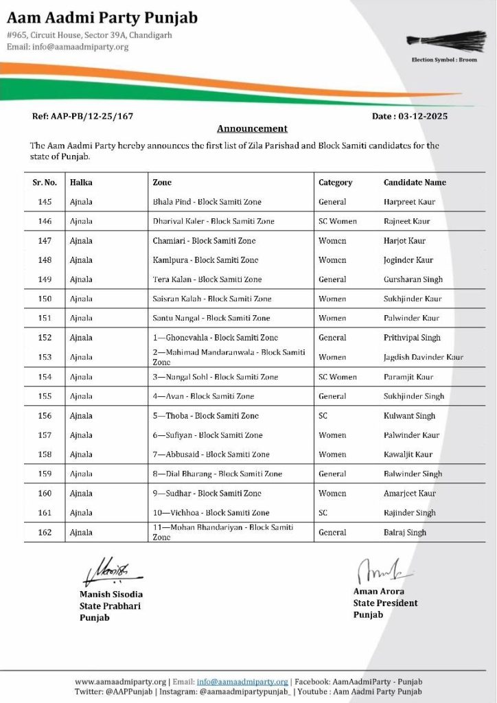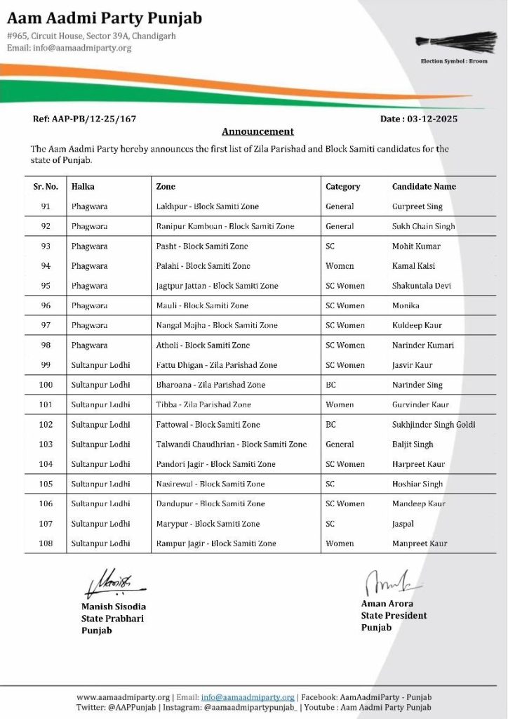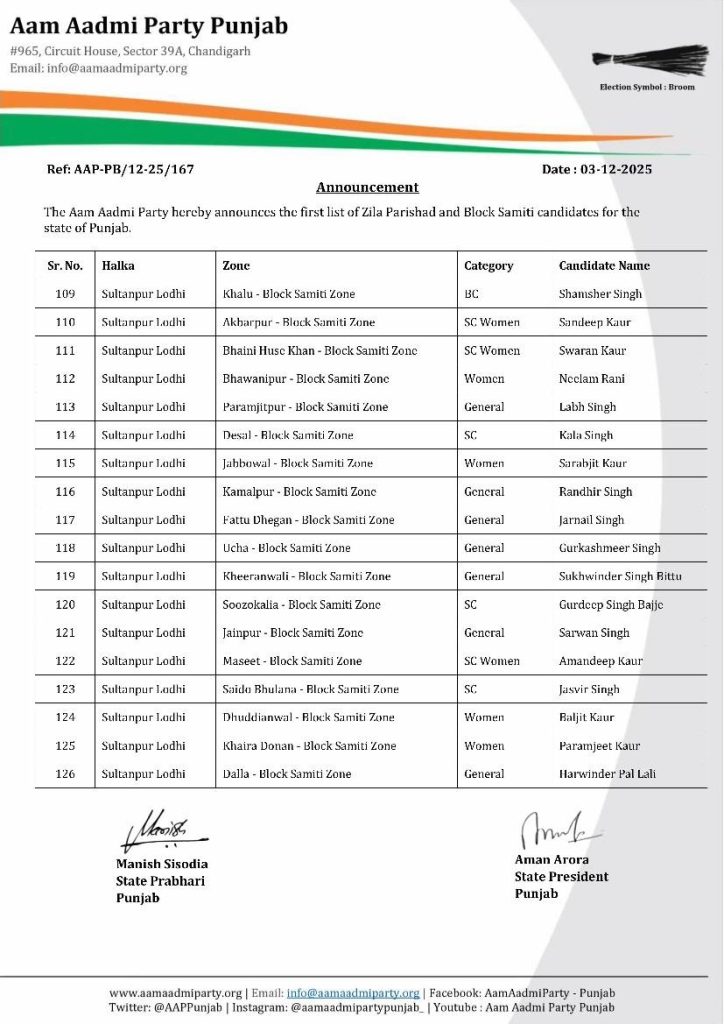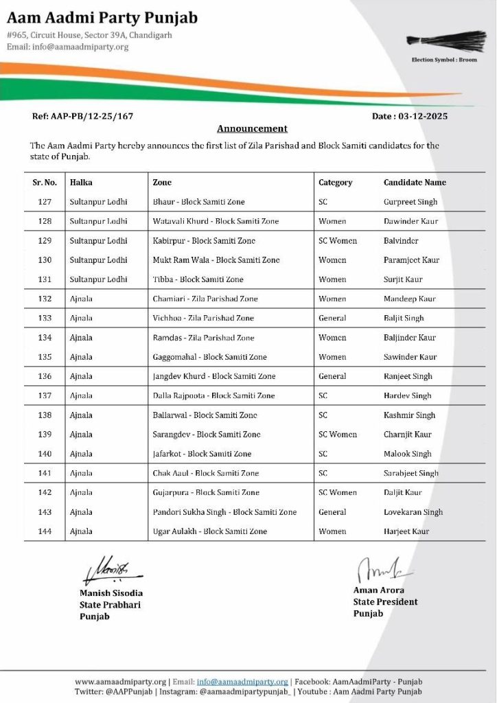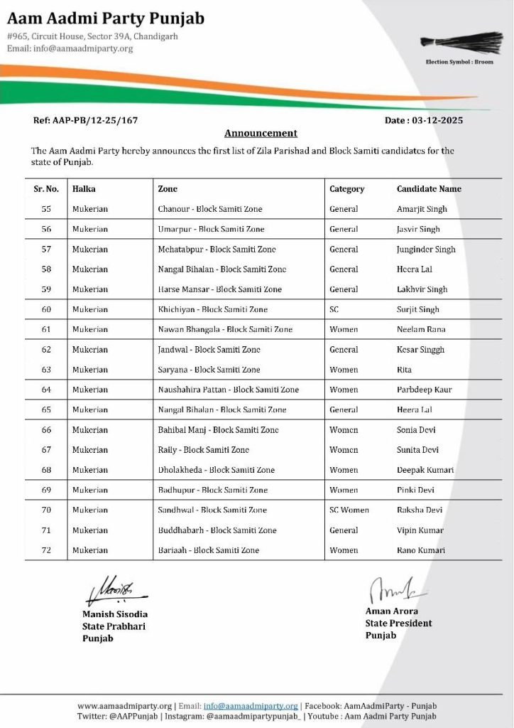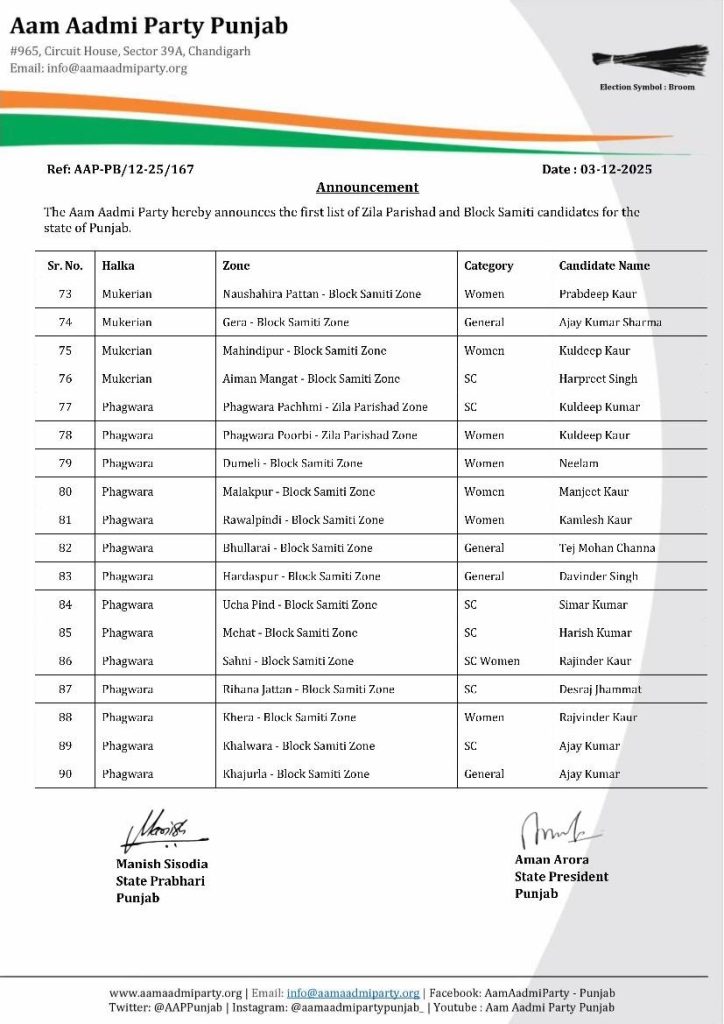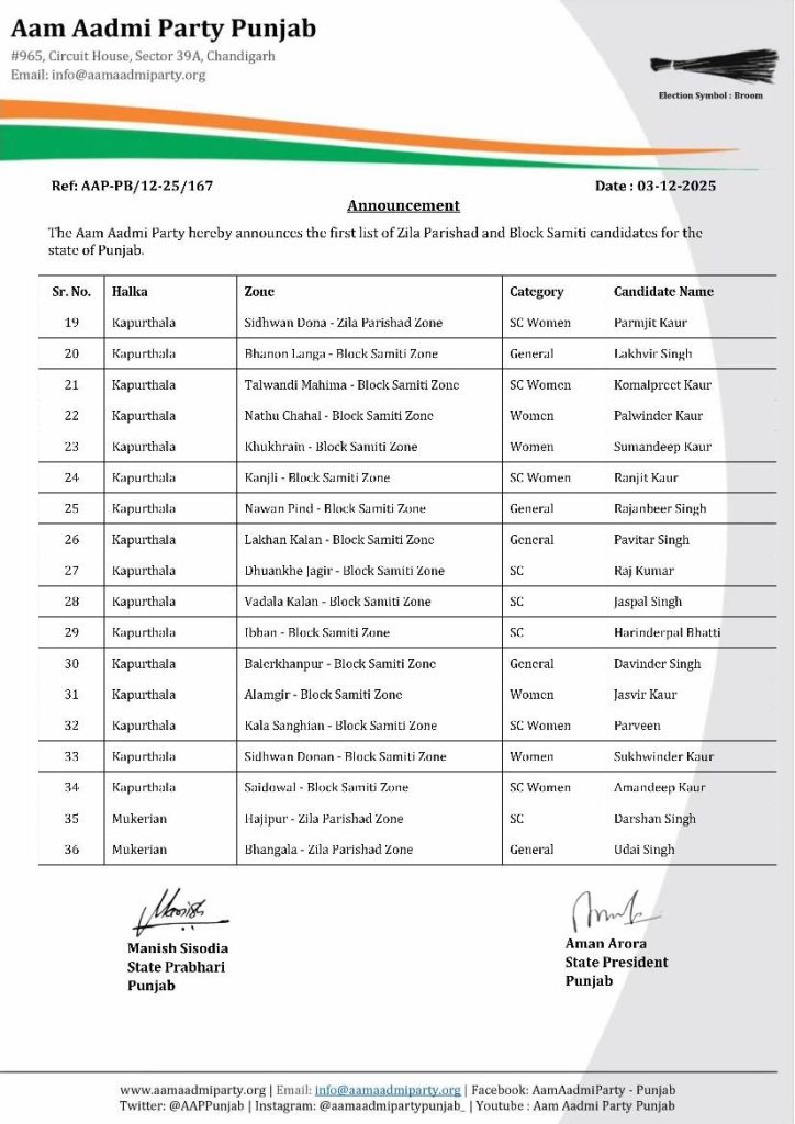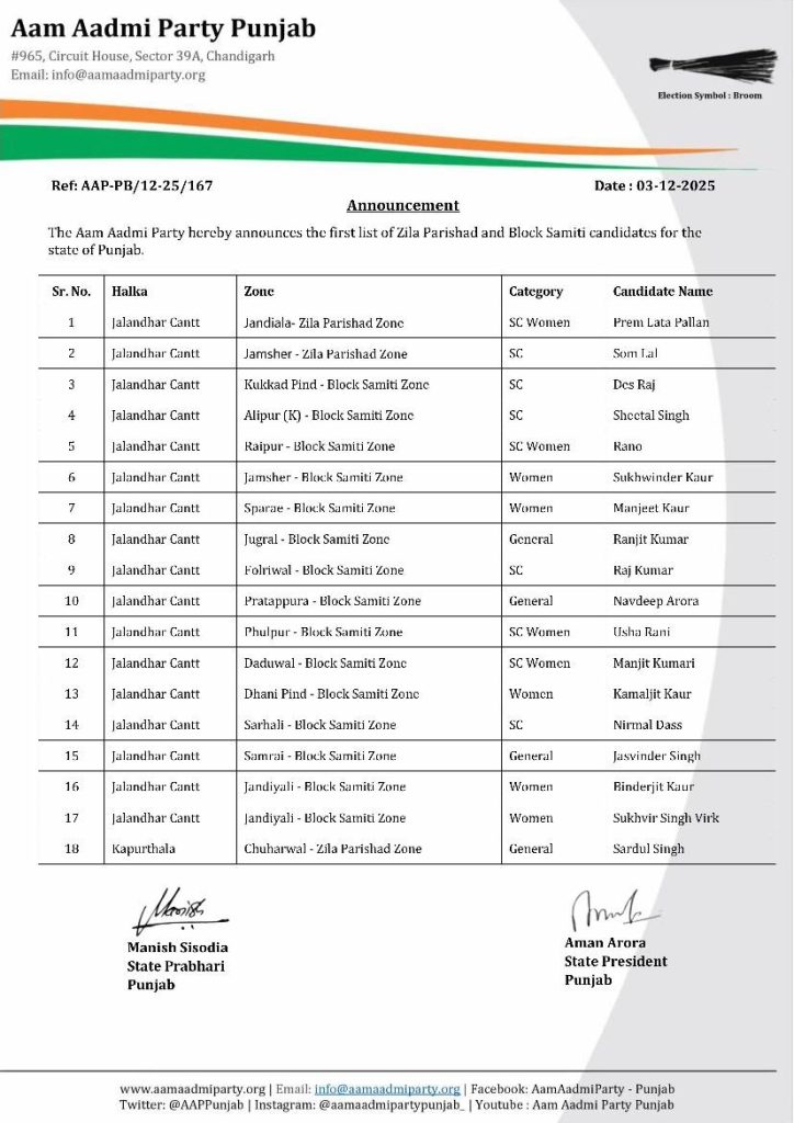 ਆਮ ਆਦਮੀ ਪਾਰਟੀ ਪੰਜਾਬ ਨੇ ਜ਼ਿਲ੍ਹਾ ਪ੍ਰੀਸ਼ਦ ਤੇ ਬਲਾਕ ਸੰਮਤੀ ਦੇ ਉਮੀਦਵਾਰਾਂ ਦੀ ਪਹਿਲੀ ਲਿਸਟ ਕੀਤੀ ਜਾਰੀ