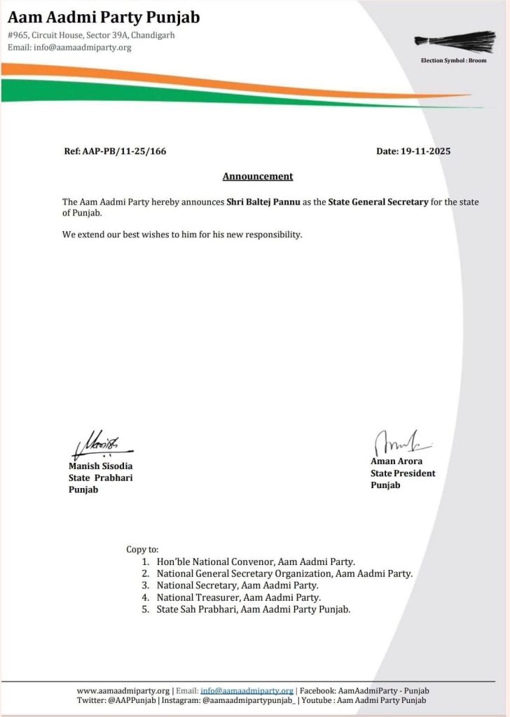 ਆਮ ਆਦਮੀ ਪਾਰਟੀ ਨੇ ਬਲਤੇਜ ਪੰਨੂ ਨੂੰ ਵੱਡੀ ਜ਼ਿੰਮੇਵਾਰੀ ਦੇ ਕੇ ਪਾਰਟੀ ਦਾ ਸੂਬਾ ਜਨਰਲ ਸਕੱਤਰ ਬਣਾਇਆ।