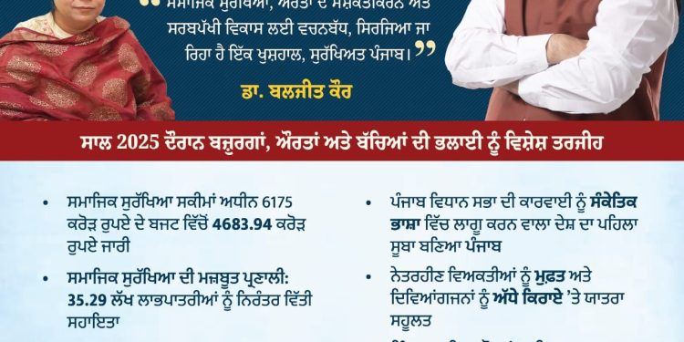 ਮੁੱਖ ਮੰਤਰੀ ਭਗਵੰਤ ਸਿੰਘ ਮਾਨ ਦੀ ਅਗਵਾਈ ਹੇਠ, ਪੰਜਾਬ ਸਰਕਾਰ ਸਮਾਜ ਦੇ ਹਰ ਵਰਗ ਦੀ ਭਲਾਈ ਲਈ ਲੋਕ-ਪੱਖੀ ਨੀਤੀਆਂ ਨੂੰ ਲਗਾਤਾਰ ਲਾਗੂ ਕਰ ਰਹੀ ਹੈ। ਸਾਲ 2025 (ਵਿੱਤੀ ਸਾਲ 2025-26) ਦੌਰਾਨ ਬਜ਼ੁਰਗਾਂ, ਔਰਤਾਂ, ਬੱਚਿਆਂ ਅਤੇ ਅਪਾਹਜਾਂ ਦੀ ਸਮਾਜਿਕ ਅਤੇ ਆਰਥਿਕ ਸੁਰੱਖਿਆ ਨੂੰ ਯਕੀਨੀ ਬਣਾਉਣ ਲਈ ਕਈ ਮਹੱਤਵਪੂਰਨ ਪਹਿਲਕਦਮੀਆਂ ਕੀਤੀਆਂ ਗਈਆਂ ਹਨ। ਇਹ ਜਾਣਕਾਰੀ ਸਮਾਜਿਕ ਸੁਰੱਖਿਆ, ਮਹਿਲਾ ਅਤੇ ਬਾਲ ਵਿਕਾਸ ਮੰਤਰੀ ਡਾ. ਬਲਜੀਤ ਕੌਰ ਨੇ ਦਿੱਤੀ।