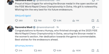 Read moreਪ੍ਰਧਾਨ ਮੰਤਰੀ ਨਰਿੰਦਰ ਮੋਦੀ ਨੇ ਅੱਜ ਦੋਹਾ ਵਿੱਚ FIDE ਵਿਸ਼ਵ ਰੈਪਿਡ ਸ਼ਤਰੰਜ ਚੈਂਪੀਅਨਸ਼ਿਪ ਵਿੱਚ ਕਾਂਸੀ ਦਾ ਤਗਮਾ ਜਿੱਤਣ ਲਈ ਅਰਜੁਨ ਏਰੀਗੈਸੀ ਅਤੇ ਕੋਨੇਰੂ ਹੰਪੀ ਨੂੰ ਵਧਾਈ ਦਿੱਤੀ। ਇੱਕ ਸੋਸ਼ਲ ਮੀਡੀਆ...