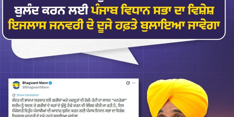 ਪੰਜਾਬ ਦੇ ਮੁੱਖ ਮੰਤਰੀ ਭਗਵੰਤ ਮਾਨ ਨੇ ਵੀਰਵਾਰ ਨੂੰ ਕੇਂਦਰ ਸਰਕਾਰ ਵੱਲੋਂ ਮਨਰੇਗਾ ਦੀ ਥਾਂ ਵੀਬੀ-ਜੀ ਰੈਮ ਜੀ (ਵਿਕਾਸ ਭਾਰਤ ਗਾਰੰਟੀ ਫਾਰ ਇੰਪਲਾਇਮੈਂਟ ਐਂਡ ਲਾਈਵਲੀਹੁੱਡ ਮਿਸ਼ਨ ਰੂਰਲ) ਸਕੀਮ ਲਿਆਉਣ ਦੇ ਫੈਸਲੇ ‘ਤੇ ਤਿੱਖੀ ਪ੍ਰਤੀਕਿਰਿਆ ਦਿੱਤੀ। ਇਸਨੂੰ ਗਰੀਬਾਂ ਦੀ ਰੋਜ਼ੀ-ਰੋਟੀ ‘ਤੇ ਸਿੱਧਾ ਹਮਲਾ ਦੱਸਦੇ ਹੋਏ ਮੁੱਖ ਮੰਤਰੀ ਨੇ ਕਿਹਾ ਕਿ ਭਾਜਪਾ ਸਰਕਾਰ ਮਹਾਤਮਾ ਗਾਂਧੀ ਦਾ ਨਾਮ ਹਟਾਉਣ ਅਤੇ ਇਸ ਯੋਜਨਾ ਦੀ ਭਾਵਨਾ ਨੂੰ ਤਬਾਹ ਕਰਨ ‘ਤੇ ਤੁਲੀ ਹੋਈ ਹੈ। ਮਾਨ ਨੇ ਐਲਾਨ ਕੀਤਾ ਕਿ ਸੂਬਾ ਸਰਕਾਰ ਇਸ ਮੁੱਦੇ ‘ਤੇ ਪੰਜਾਬੀਆਂ ਦੀ ਆਵਾਜ਼ ਬੁਲੰਦ ਕਰਨ ਲਈ ਜਨਵਰੀ ਦੇ ਦੂਜੇ ਹਫ਼ਤੇ ਪੰਜਾਬ ਵਿਧਾਨ ਸਭਾ ਦਾ ਵਿਸ਼ੇਸ਼ ਸੈਸ਼ਨ ਬੁਲਾਏਗੀ। ਇਹ ਫੈਸਲਾ ਆਮ ਆਦਮੀ ਪਾਰਟੀ ਦੇ ਰਾਸ਼ਟਰੀ ਕਨਵੀਨਰ ਅਰਵਿੰਦ ਕੇਜਰੀਵਾਲ ਸਮੇਤ ਚੋਟੀ ਦੇ ਆਗੂਆਂ ਨਾਲ ਮੀਟਿੰਗ ਤੋਂ ਬਾਅਦ ਲਿਆ ਗਿਆ।