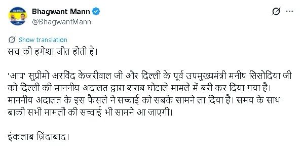ਕੇਜਰੀਵਾਲ ਤੇ ਮਨੀਸ਼ ਸਿਸੋਦੀਆ ਦੇ ਬਰੀ ਹੋਣ ਮਗਰੋਂ ਪੰਜਾਬ ਦੇ ਮੁੱਖ ਮੰਤਰੀ ਭਗਵੰਤ ਮਾਨ ਨੇ ਟਵੀਟ ਕੀਤਾ ਤੇ ਕਿਹਾ ਕਿ ‘ਸੱਚ ਦੀ ਹਮੇਸ਼ਾ ਜਿੱਤ ਹੁੰਦੀ ਹੈ’। ‘ਆਪ’ ਸੁਪਰੀਮੋ ਅਰਵਿੰਦ ਕੇਜਰੀਵਾਲ ਜੀ ਤੇ ਦਿੱਲੀ ਦੇ ਉਪ ਮੁੱਖ ਮੰਤਰੀ ਮਨੀਸ਼ ਸਿਸੋਦੀਆ ਜੀ ਨੂੰ ਦਿੱਲੀ ਦੀ ਮਾਣਯੋਗ ਅਦਾਲਤ ਵੱਲੋਂ ਸ਼ਰਾਬ ਘੋਟਾਲੇ ਵਿਚੋਂ ਬਰੀ ਕਰ ਦਿੱਤਾ ਗਿਆ ਹੈ। ਮਾਣਯੋਗ ਅਦਾਲਤ ਦੇ ਇਸ ਫੈਸਲੇ ਨੇ ਸੱਚਾਈ ਨੂੰ ਸਾਰਿਆਂ ਸਾਹਮਣੇ ਲਿਆ ਦਿੱਤਾ ਹੈ। ਸਮੇਂ ਦੇ ਨਾਲ ਬਾਕੀ ਸਾਰੇ ਮਾਮਲਿਆਂ ਦੀ ਸੱਚਾਈ ਵੀ ਸਾਹਮਣੇ ਆ ਜਾਵੇਗੀ। ਇਨਕਲਾਬ ਜ਼ਿੰਦਾਬਾਦ!