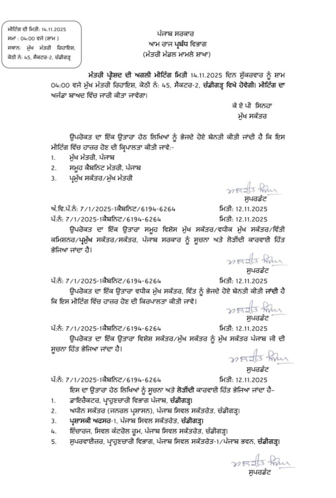 ਇਹ ਮੀਟਿੰਗ 14 ਨਵੰਬਰ ਦਿਨ ਸ਼ੁੱਕਰਵਾਰ ਨੂੰ ਸ਼ਾਮ 4 ਵਜੇ ਮੁੱਖ ਮੰਤਰੀ ਨਿਵਾਸ ‘ਤੇ ਹੋਵੇਗੀ। ਇਸ ਮੀਟਿੰਗ ਦੌਰਾਨ ਕਈ ਅਹਿਮ ਫ਼ੈਸਲਿਆਂ ‘ਤੇ ਮੋਹਰ ਲੱਗ ਸਕਦੀ ਹੈ।