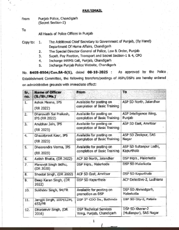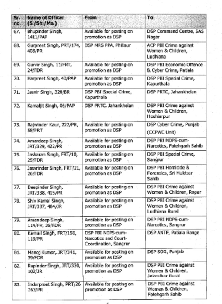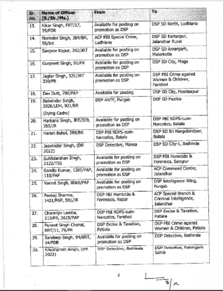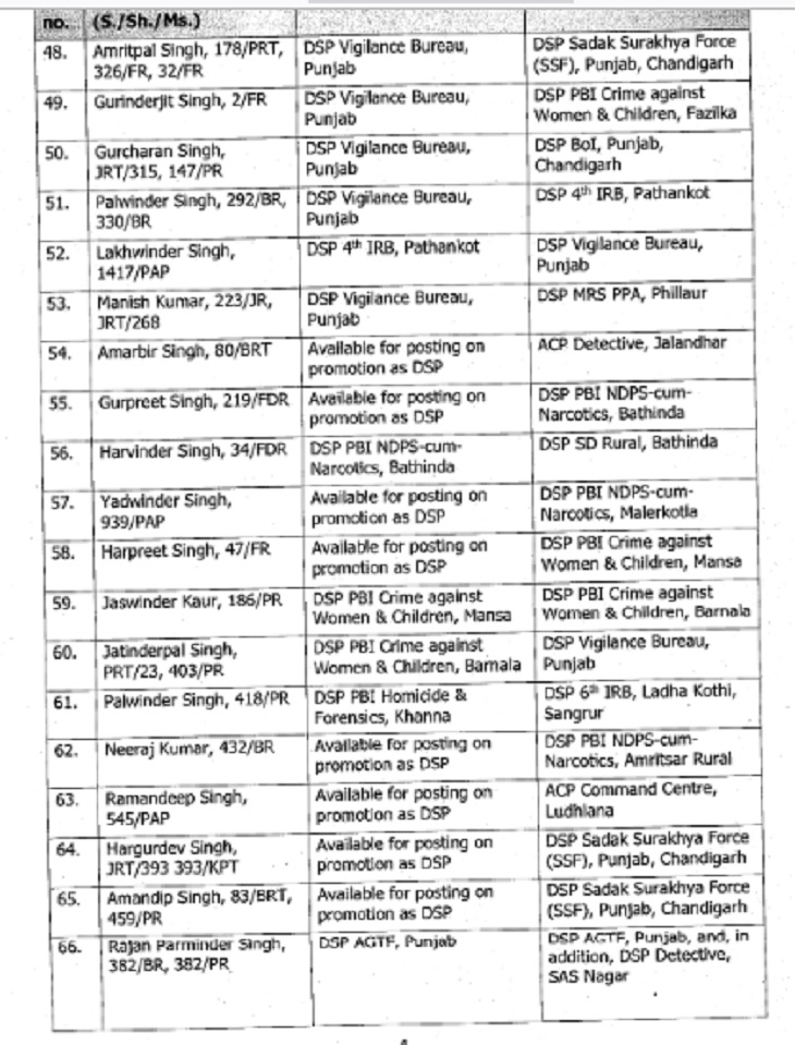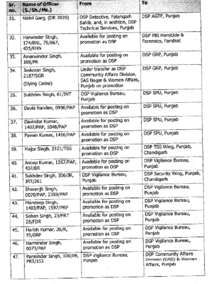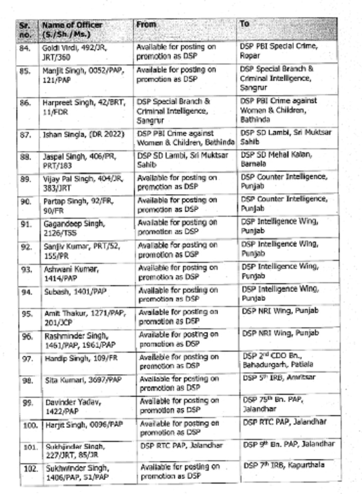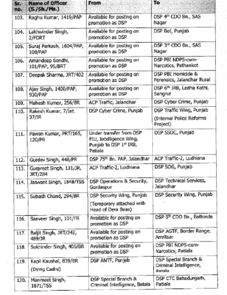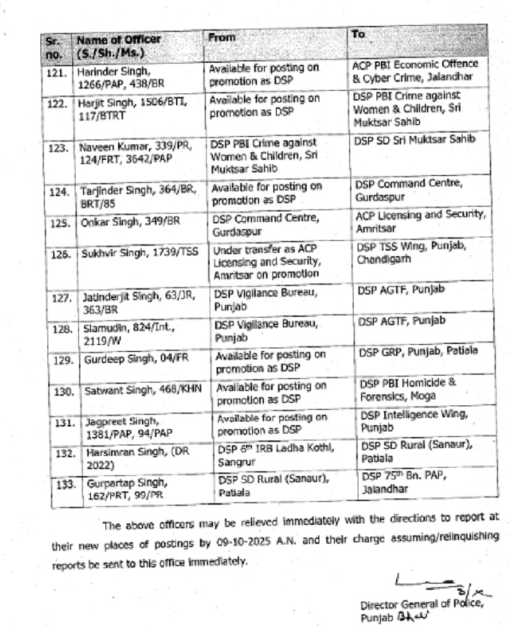 Punjab DSP ASP Transfer: ਪੰਜਾਬ ਪੁਲਿਸ ਨੇ ਵੱਡੀ ਗਿਣਤੀ ਵਿੱਚ DSP ਅਤੇ ASP ਰੈਂਕ ਦੇ ਅਧਿਕਾਰੀਆਂ ਦੇ ਤਬਾਦਲੇ ਕੀਤੇ ਹਨ। 133 ਅਧਿਕਾਰੀਆਂ ਦੇ ਤਬਾਦਲੇ ਦੇ ਹੁਕਮ ਜਾਰੀ ਕੀਤੇ ਗਏ ਹਨ। ਇਸ ਸਮੇਂ ਦੌਰਾਨ ਨਿਯੁਕਤ ਕੀਤੇ ਗਏ ਅਧਿਕਾਰੀ ਕਾਫ਼ੀ ਸਮੇਂ ਤੋਂ ਪੋਸਟਿੰਗ ਦੀ ਉਡੀਕ ਕਰ ਰਹੇ ਸਨ। ਇਨ੍ਹਾਂ ਅਧਿਕਾਰੀਆਂ ਨੂੰ ਵਿਜੀਲੈਂਸ ਬਿਊਰੋ ਅਤੇ ਰੋਡ ਸੇਫਟੀ ਫੋਰਸ ਸਮੇਤ ਵੱਖ-ਵੱਖ ਵਿੰਗਾਂ ਵਿੱਚ ਤਾਇਨਾਤ ਕੀਤਾ ਗਿਆ ਹੈ।