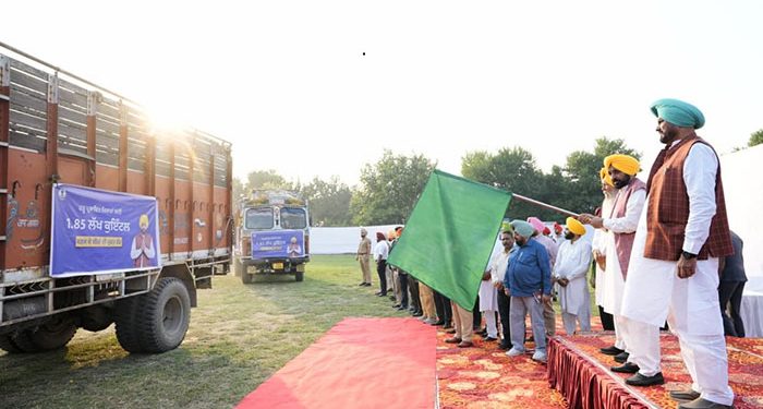 ਅੰਮ੍ਰਿਤਸਰ : ਸੂਬੇ ਦੇ ਹੜ੍ਹ ਪੀੜਤਾਂ ਨਾਲ ਕੀਤੇ ਇੱਕ ਹੋਰ ਵਾਅਦੇ ਨੂੰ ਪੂਰਾ ਕਰਦਿਆਂ ਪੰਜਾਬ ਦੇ ਮੁੱਖ ਮੰਤਰੀ ਭਗਵੰਤ ਸਿੰਘ ਮਾਨ ਨੇ ਹਾਲ ਹੀ ਵਿੱਚ ਆਏ ਹੜ੍ਹਾਂ ਦੌਰਾਨ ਨੁਕਸਾਨੀ ਗਈ ਲਗਭਗ ਪੰਜ ਲੱਖ ਏਕੜ ਜ਼ਮੀਨ ਵਿੱਚ ਆਪਣੀ ਫਸਲ ਗੁਆਉਣ ਵਾਲੇ ਕਿਸਾਨਾਂ ਨੂੰ ਦੋ ਲੱਖ ਕੁਇੰਟਲ ਕਣਕ ਦੇ ਬੀਜ ਮੁਫ਼ਤ ਮੁਹੱਈਆ ਕਰਵਾਉਣ ਲਈ ਅੱਜ ਸੱਤ ਟਰੱਕਾਂ ਨੂੰ ਹਰੀ ਝੰਡੀ ਦੇ ਕੇ ਰਵਾਨਾ ਕੀਤਾ।
